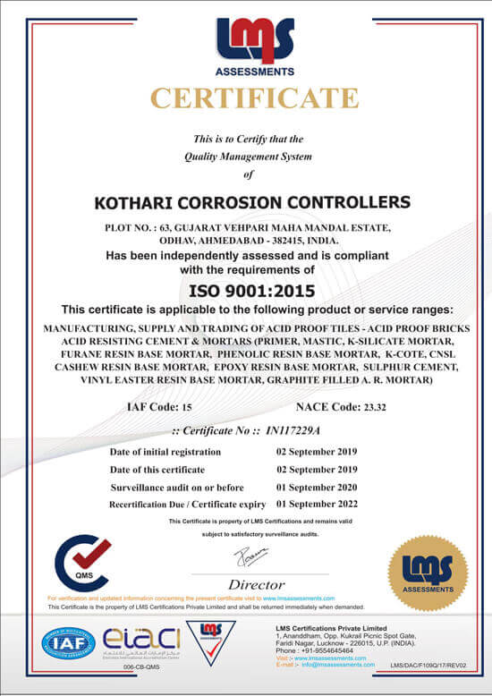 We are into Corrosion Technology since 1969, with Manufacturing Facilities at Odhav, Ahmedabad under the Sole Proprietorship of Mr. Jignesh Kothari. at Ahmedabad, Gujarat, India. Since the commencement of our journey, we are involved in Manufacturing, Application, and Exporting Premium & Consistent Quality of Acid Proof Tiles, Acid Proof Bricks & Acid Resisting Bedding & Joint Filling Mortar.